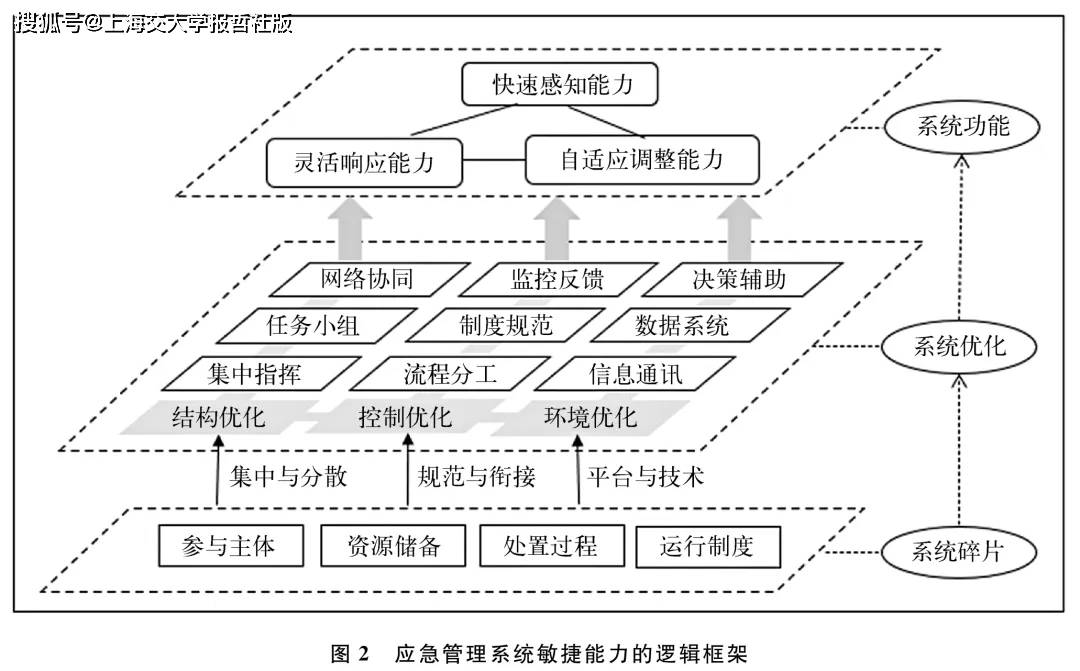 应急管理系统是一个以任务为核心的多元参与、结构复杂、动态交互的系统。因此,在碎片化的现实情境下提升灵敏感知、快速应对和动态适应等敏捷能力,意味着应急管理系统要在系统结构、系统管理与控制和系统赋能环境等系统功能要素上作出调整。
