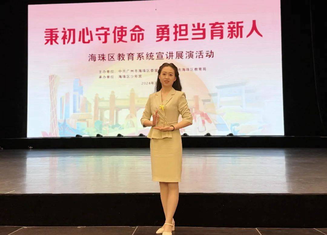 2024年3月18日,在“秉初心守使命 勇担当育新人”海珠区教育系统宣讲展演上,我校党员教师陈菲老师在展演中作主题为《传承红色基因 汲取奋进力量》的演讲,并以优异的成绩荣获大赛一等奖。