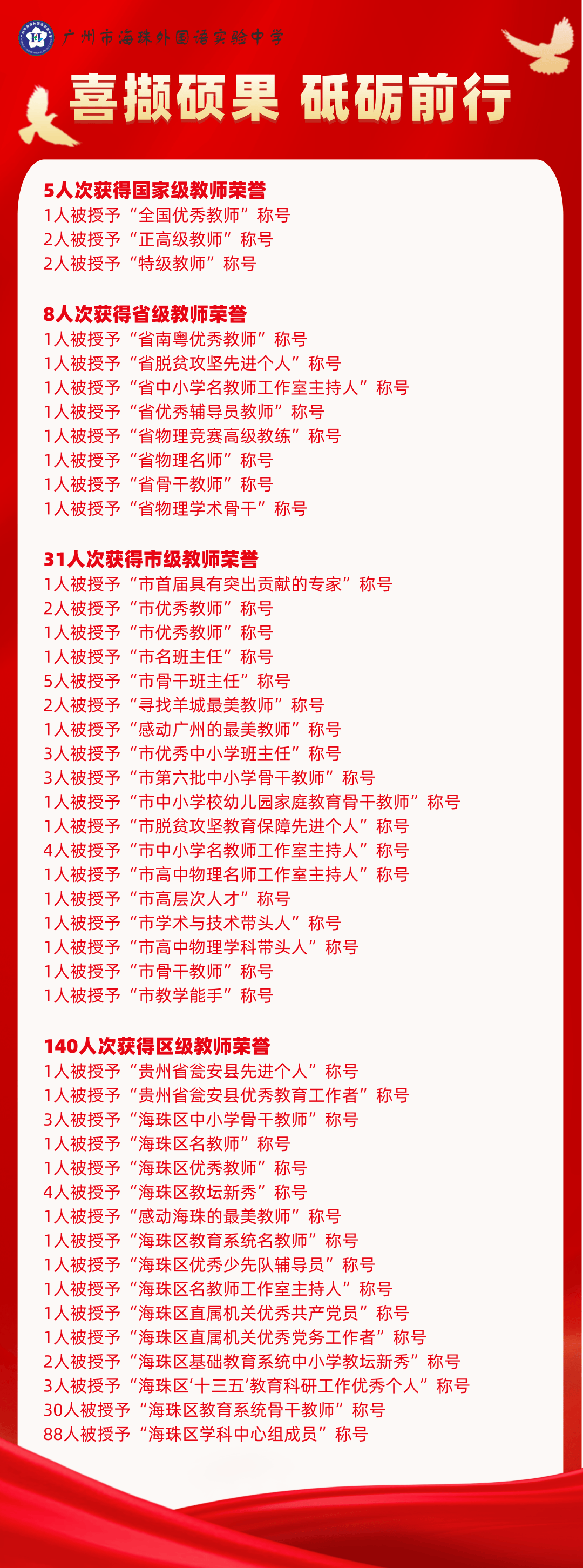在建设教育强国号角的引领下,广州市海珠外国语实验中学将以“心有大我、至诚报国的理想信念,言为士则、行为世范的道德情操,启智润心、因材施教的育人智慧,勤学笃行、求是创新的躬耕态度,乐教爱生、甘于奉献的仁爱之心,胸怀天下、以文化人的弘道追求的教育家精神”为目标,进一步优化结构、提高素质、规范管理、加强保障,全面推进教师队伍建设实现高质量发展,助推学校教育高质量发展。返回搜狐,查看更多